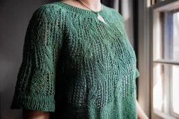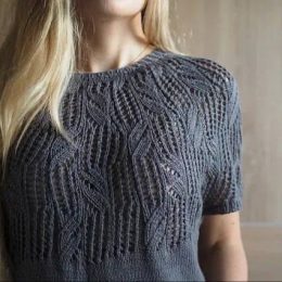 Элегантный вязаный топ тёмно-серого цвета выполнен в технике ажурного вязания, создавая изысканный узор, напоминающий листья. Этот стильный и женственный фасон...