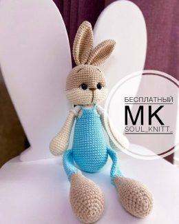 Посмотрите на этого очаровательного зайчика! У него нежный бежевый цвет и милый голубой комбинезон, который придает игрушке стильный и уютный вид. Большие ушки...