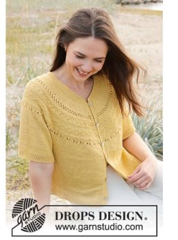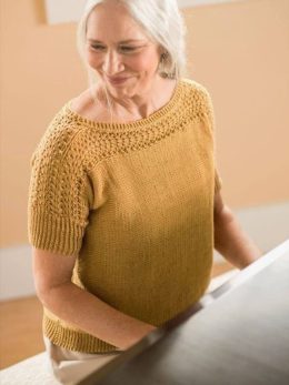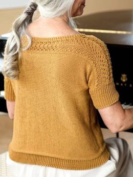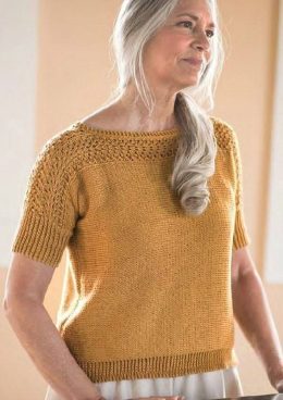 Элегантный вязаный топ с короткими рукавами выполнен в теплых горчичных тонах. Узор кокетки привлекает внимание своей ажурной текстурой, добавляя изюминку и сти...