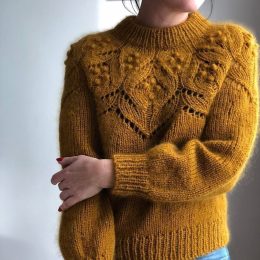 Этот уютный свитер ручной работы выполнен спицами из мягкой пряжи горчичного цвета, напоминающего теплые осенние листья. Ажурный узор с объемными элементами при...