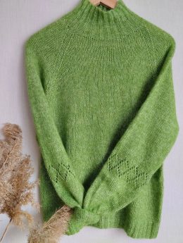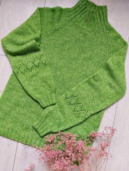 Этот рукодельный свитер выполнен в ярком зеленом цвете, привлекающем внимание своим свежим оттенком. Модель с высоким воротником и длинными рукавами имеет стиль...