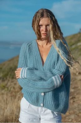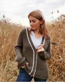 Приветствую! Вот наш очаровательный кардиган — это воплощение стиля и комфорта. Вязаный шедевр с уютными полосками, сочетающими белый, синий, коричневый и бирюз...
