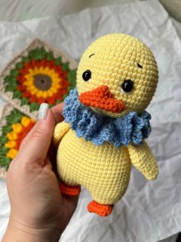 Очаровательная вязаная утка амигуруми, выполненная в нежно-желтых тонах, с ярким оранжевым клювом и лапками. Ее выразительные черные глазки придают игрушке живо...
