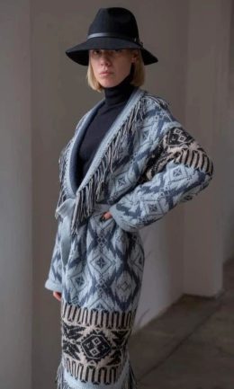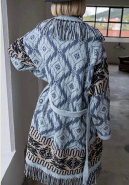 Этот стильный вязаный кардиган выполнен в пастельных тонах: преобладают голубые и серые оттенки. Геометрический орнамент и бахрома придают изделию этнический ша...