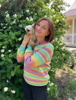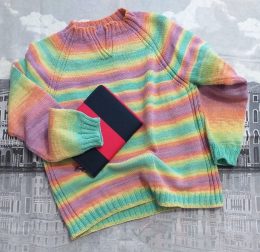 Яркий вязаный свитер, выполненный в стиле "омбре", удивляет плавным переходом цветов радуги. Уютное изделие имеет классический фасон с длинными рукавами и кругл...