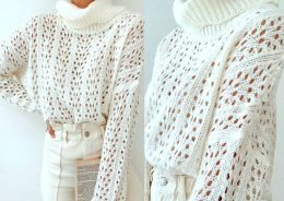 Этот вязаный крючком свитер с высоким воротником выполнен в нежно-белом цвете и привлекает внимание ажурным узором. Мягкая и воздушная текстура напоминает о зим...