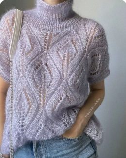 Этот восхитительный рукодельный свитер с высоким горлом и короткими рукавами выполнен в нежном лавандовом цвете. Ажурный узор придает изделию легкость и воздушн...