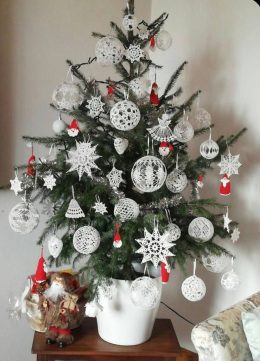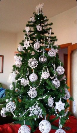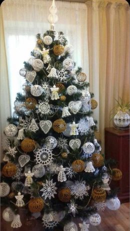 Эта великолепная рукодельная елка украшена изысканными кружевными изделиями, которые создают заметный контраст на фоне зелени. Белые ажурные шары, звезды и снеж...