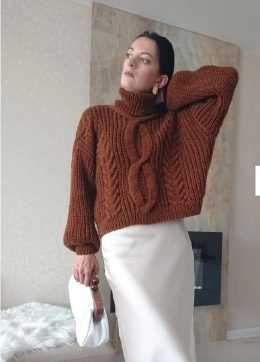 Этот уютный коричневый свитер с высоким воротником и крупными косами напоминает мне, как в детстве я пыталась связать что-то подобное для своей куклы. Толстая п...