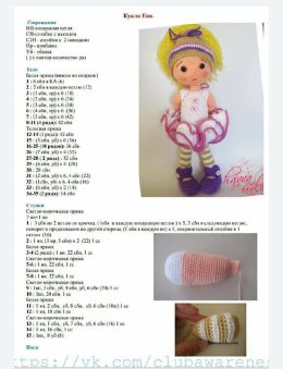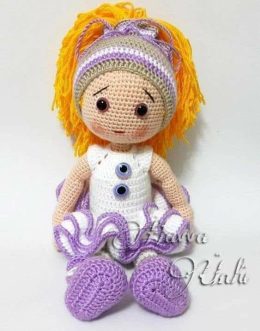 Посмотрите на этого милого вязаного персонажа! С рыжими волосами и очаровательным платьем с оборками, она готова украсить любой интерьер. У нее милые фиолетовые...