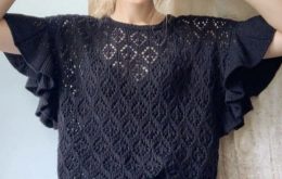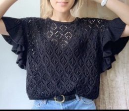 Очаровательный образ: этот вязаный топ пленяет своей ажурной текстурой и игривыми воланами на рукавах. Чёрный цвет придаёт изделию элегантность, а лёгкость узор...