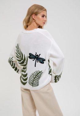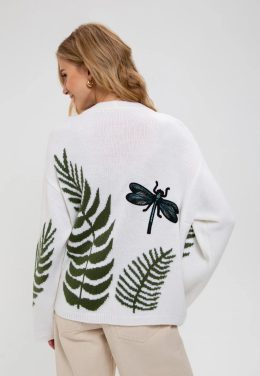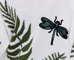 Знаете ли вы, что драконовидные узоры часто символизируют перемены и трансформацию? Этот вязаный свитер с изображением стрекозы и зелеными папоротниками создает...