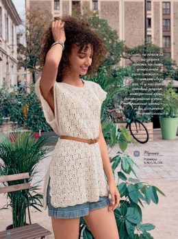 Рукодельное изделие спицами, выполненное в кремовом цвете, отличается свободным фасоном и изысканным ажурным узором. Легкий и воздушный стиль подчеркивает уника...