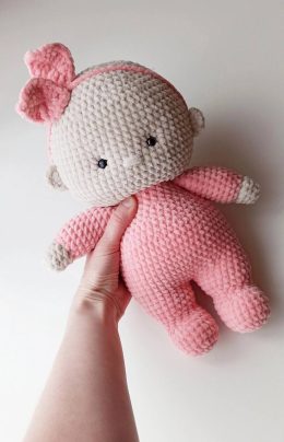 Очаровательный образ этого вязаного малыша с розовым бантиком и мягким костюмом мгновенно вызывает улыбку. Пушистая текстура пряжи и милые глазки делают его иде...