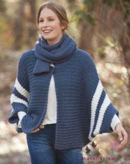 Элегантное темно-синее пончо с белыми полосами, выполненное в технике ручного вязания, дополнено стильным шарфом. Уникальная текстура изделия создается за счет...