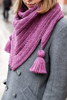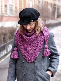 Этот вязаный крючком шарф-снуд — настоящий шедевр из пряжи. Глубокий фиолетовый оттенок придает ему изысканность, а крупные кисти по краям добавляют нотку игрив...