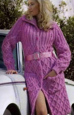Вам потребуется: 1900 г сиреневой пряжи MONDIAL MERINO MAXI (50% мериносовой шерсти, 50% акрила, 60 м/100г); прямые спицы № 6 и № 8; вспомогательная спица; 6 пуговиц; атласный пояс шириной 5 см с металлической пряжкой; штопальная игла.