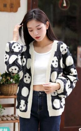 Вспоминается, как в детстве я обожал перебирать мягкие игрушки, и эта кофта словно воплощение тех воспоминаний. Уютная вязка с забавными мордочками панд делает её не просто тёплой вещью, а настоящим арт-объектом. Объёмные рукава и контрастная окантовка придают ей особый шарм, а черно-белая гамма идеально сочетается с любым стилем.