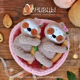 Очаровательные вязаные игрушки в виде ленивцев, выполненные в пастельных тонах. Эти милые создания держат в лапках яркие веточки, добавляя яркости образу. Корич...