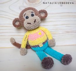 Этот очаровательный плюшевый примат в ярких желтых штанишках с подтяжками просто сияет от радости. Ушки и глазки придают ему невероятно милый вид, а текстура материала делает его особенно приятным на ощупь.