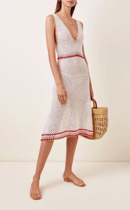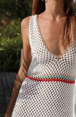 Изделие выполнено в технике открытого вязания с использованием тонкой пряжи, что придаёт ему лёгкость и воздушность. Особое внимание уделено сочетанию белой основы с яркими горизонтальными полосами красного, голубого и бежевого цветов, создающими эффект контрастного акцента на талии. Глубокий V-образный вырез украшен аккуратной каймой, подчёркивающей изящество модели. Такое платье идеально подходит для тёплых дней, сочетая стиль и комфорт благодаря уникальному узору и цветовой гамме.