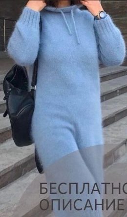Окунитесь в уют и стиль с этим вязаным платьем из мягкой голубой пряжи. Свободный крой и завязки на капюшоне добавляют комфорта, а длинные рукава согревают в прохладные дни. Элегантность и простота в каждой детали делают это платье идеальным выбором для повседневного гардероба.