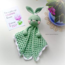 Мягкий вязаный плед с головой зайчика и милыми румянами, который станет любимым спутником вашего малыша. Особенность — ажурный узор с контрастной белой каймой и аккуратные ручки для крепкого объятия.