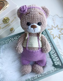 Посмотрите, какой очаровательный мишка крючком у Вас получился! У него такие милые фиолетовые штанишки и уютная шапочка с цветком — просто прелесть! Как Вам удаётся создать такое чудо из пряжи?