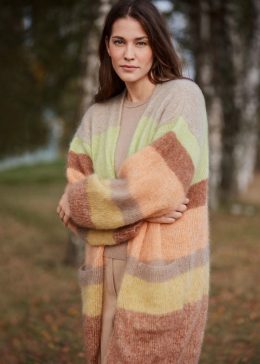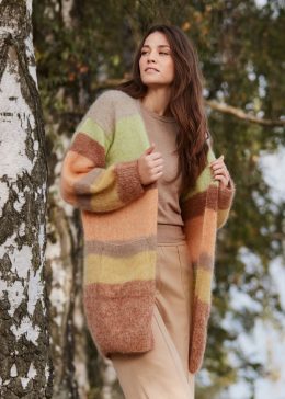Мягкий и уютный кардиган с широкими полосами нежных оттенков и объемными рукавами, идеально подходит для прохладных дней. Кардиган