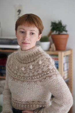 Свободный свитер с короткими рукавами украшен красно-синим орнаментом в стиле фольклорных мотивов на светлом фоне. Особенность модели — контрастные полосатые ма...