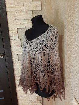 Внезапно, это пончо раскрывается в ажурном узоре, словно кружевная паутина, сплетенная из нитей нежности. Градиентный переход от светлого к темному создает эффект омбре, добавляя глубину и изысканность.
