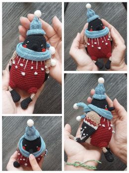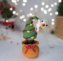 Когда кот Бублик решил стать елочной игрушкой, он выбрал лучший костюм! Эта вязаная композиция удивляет своей игривостью: зеленая елка с разноцветными гирляндами и котиком, который, кажется, вот-вот прыгнет с вершины. Все это уютно расположилось в горшке с милым бантиком. Настоящий шедевр новогоднего настроения!
