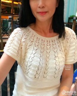 Топ выполнен спицами из мягкой пряжи с оригинальным листовым узором, который придает изделию легкость и воздушность. Отличается аккуратными боковыми вставками и...