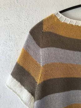 Легкий пуловер с коротким рукавом выполнен в технике гладкого вязания с аккуратными полосами горчичного, серого и белого оттенков. Особенность модели — контрастная белая резинка на манжетах и горловине, а также плавный переход цвета на плечевых швах, создающий гармоничный и стильный вид.