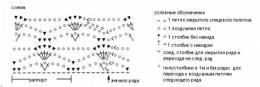 Деталь расправить и оставить под влажным полотном до полного высыхания. Сшить рукава и закрыть боковые швы. Обвязать вырез горловины крючком согласно схеме, при этом начинать от стрелки, заканчивать каждый ряд . После 6-го ряда провязать еще один ряд столбиков без накида и один ряд «рачьим шагом» (столбики без накида слева направо), закончить работу.