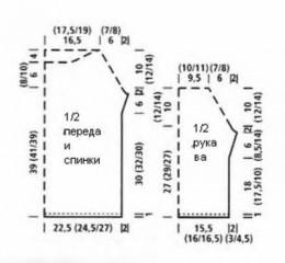 Набрать 117 (125/137)п. на спицы № 3,5, вязать первых 3р. узором «узелки», начать с изнаночного ряда следующим образом: кромочная, лицевая, изн. и т.д. по рисунку, закончить ряд лицевой и кромочной. Далее вязать спицами № 4: кромочная, 7 (9/13) п. основного узора, *29п. фантазийного узора, 7 (9/11)п. основного узора, повторить от * 1 раз, 29п. фантазийного узора, 7 (9/13)п. основного узора, кромочная. На высоте полотна 31 (33/31)см, т.е. через 90 (96/90)р. прибавить 1х1п. с каждой стороны детали, затем в каждом 4-м ряду прибавить еще 3х1п. = 125 (133/145)п. Добавленные петли включать в вязание основным узором. На высоте 37(39/37)см, т.е. через 108 (114/108)р. закрыть для пройм с обеих сторон в каждом 2-м ряду 1хЗп. и 2х1п., отложить оставшиеся 115 (123/135)п., высота детали равна 39 (41/39)см.