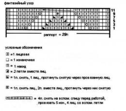 Фантазийный узор: см. схему. Указаны только лицевые ряды, в изнаночных петли вязать по рисунку. Повторять с 1-го по 12-й ряд.