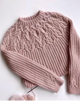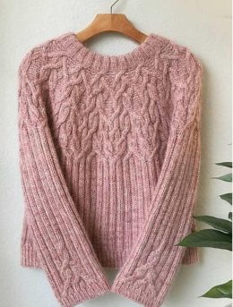 Этот вязаный свитер удивляет своими сложными узорами, которые плавно переходят от горловины к телу. Тонкий розовый оттенок и объемные косы придают изделию элегантность, а мягкая текстура обеспечивает комфорт.