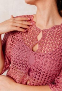Нежная кофточка, связанная крючком из тонкой хлопковой пряжи с оригинальным узором из ромбовидных прорезей на лифе и рукавах. Идеально подходит для теплых дней,...
