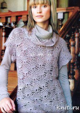 Перед: Набрать цепочку из 89 в. п. и вяз. узором по схеме. На высоте 51 см наметить с обеих сторон проймы и вяз. прямо. На высоте 60 см от начала вязания, учитывая, что должен быть связан 8-й р. схемы, закрыть для выреза горловины центральные п. и вяз. по 23 п. каждого плеча отдельно. На общей высоте 70 см закончить вязание.