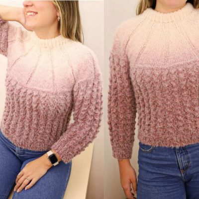 Свитер, связанный спицами, представляет собой классический образец рукоделия, история которого уходит корнями в древние времена, когда вязание использовали для создания теплой одежды в холодные сезоны. Этот свитер отличается нежным градиентом от кремового верха к насыщенно-розовому низу, что придаёт ему особую элегантность. Особое внимание привлекают объемные узоры, создающие текстурный эффект, который подчеркивает мастерство вязальщицы.