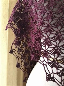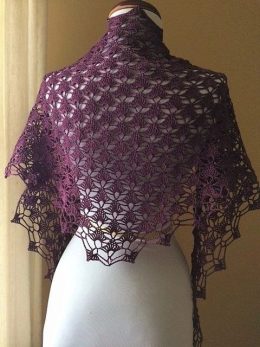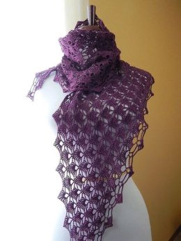 Здравствуйте, дорогая! Посмотрите, какое восхитительное вязаное изделие! Этот ажурный платок, словно паутинка, создан из тончайшей пряжи. Обратите внимание на изысканный узор и богатый фиолетовый цвет, который добавляет шарма и утонченности. Просто находка для любого гардероба!