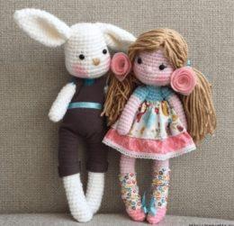 Грейс и Джек — куколка и кролик амигуруми. Описание вязания крючком. Обратите внимание: куколка и кролик вяжутся одинаково, по одной схеме, за исключением длинных ушек.