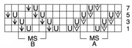 Ажурный узор: число петель кратно 4 + 1+2 кром. Вязать по схеме, на которой приведены только лиц. р., в изн. р. все петли и накиды вязать изн. Начинать с кром. и петель перед раппортом А, повторить 5 (6) 7 раз раппорт А, 1 раз петли между раппортами, 5 (6) 7 раз раппорт В, заканчивать петлями после раппорта В и кром.
