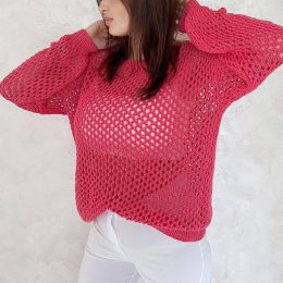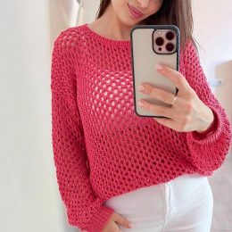 Очаровательный образ вязаного свитера добавляет изюминку в каждый кадр. Выделяются крупные петли и насыщенный розовый цвет, создавая эффектный акцент в любом наряде.