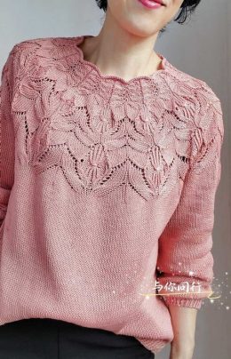 Вы только посмотрите, какой замечательный свитер! Эта нежно-розовая вещь впечатляет своим изысканным ажурным узором на кокетке. Листочки кажутся такими воздушными и утонченными, не правда ли?