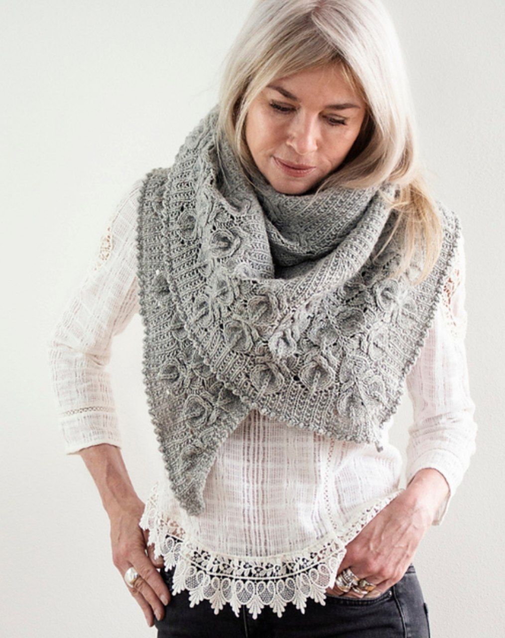 Уникальная вязаная шаль с объемными узорами в виде переплетенных петель и рельефной текстурой, выполненная спицами из мягкой пряжи светло-серого цвета. Особенность модели — сочетание плотной резинки и выразительного трехмерного узора, создающего эффект глубины и уюта.