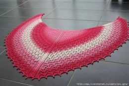 Шаль, связанная спицами, поражает градиентом от насыщенного розового к нежно-белому, создавая эффектный переход.