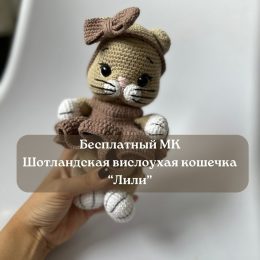 На фоне нежного бежевого цвета выделяются белоснежные лапки, а очаровательная мордочка украшена выразительными усами. Плюшевая игрушка с повязкой на ушах и милым платьем создаёт уют и радость.