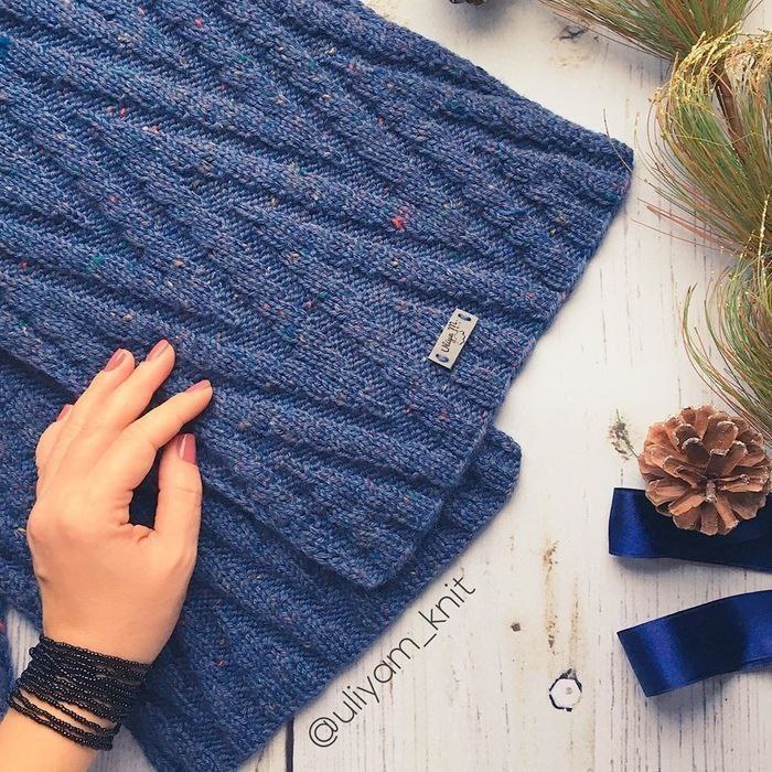 Тёплый снуд, связанный спицами из меланжевой пряжи с выразительным косым узором. Особенность — аккуратная металлическая бирка с надписью и мягкая фактура, создающая уют и стиль одновременно.
